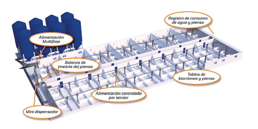 El sistema está preparado para controlar y gestionar sistemas multiase de pienso seco. Puede aplicar una alimentación multifase por animal o por abrevadero. Se pueden pesar, mezclar y/o triturar hasta treinta tipos de pienso diferentes, lo que significa que puede componer su propio pienso. Los puntos de alimentación pueden llenarse mediante un control por sensores que le permite ajustar las cantidades de pienso a la perfección. El cambio de un pienso a otro se efectúa de forma gradual para que los animales no extrañen el pienso nuevo. Los componentes del pienso pueden traerse desde los silos o añadirse con ayuda de dispensadores de pienso. El ordenador proporciona una visión de conjunto clara del consumo de pienso. este ordenador está equipado con una pantalla gráfica y un teclado numérico que facilitan y agilizan su manejo.